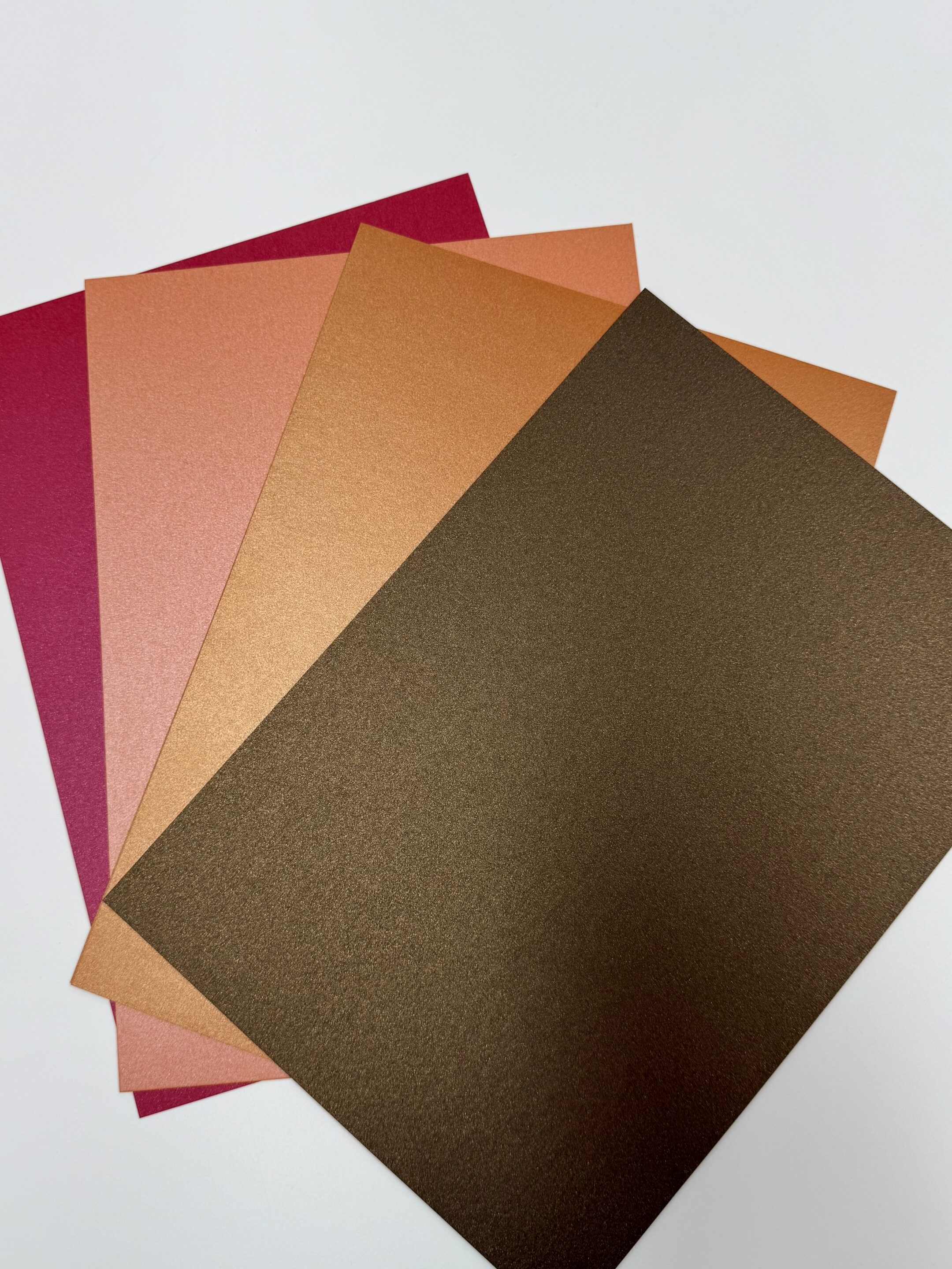 | A4 Shimmer Colours | Bronze, Copper, Flame Orange, Jupiter Red, Diamond White, Ice Gold, Quartz Ivory, White Gold, Opal Cream, Gold Leaf, Champagne, Lustre Oyster, Princess Silver, Galvanised Silver, Ionised Charcoal Grey, Cocktail Hour Black, Botanic Green, Vista Blue, Sapphire Blue, Blue Moon, Blueprint, Amethyst Purple, Violette Purple, Nude Pink, Fairy Pink, Pastel Pink |